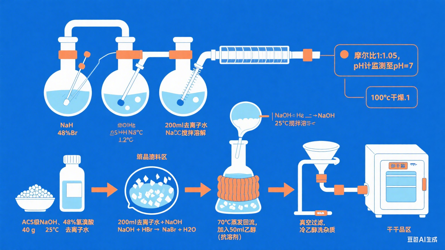 完全结晶后,通过真空过滤将固体溴化钠从母液中分离出来。用冷乙醇彻底洗涤晶体,以去除残余杂质和过量的反应物,从而确保高纯度的溴化钠。